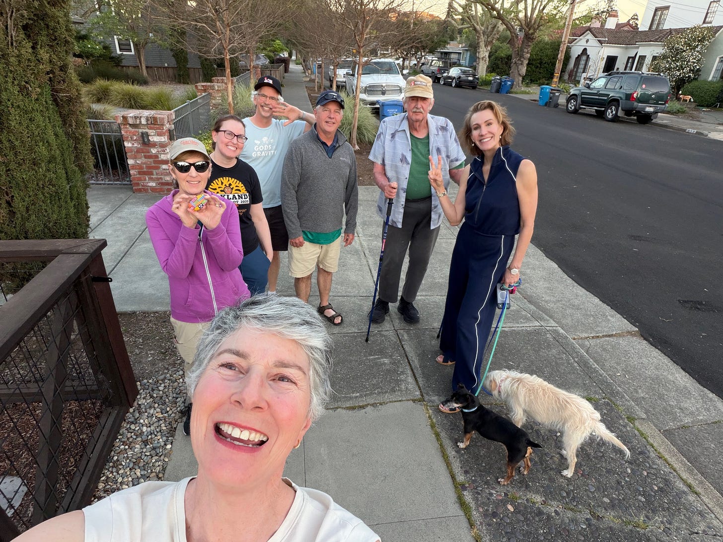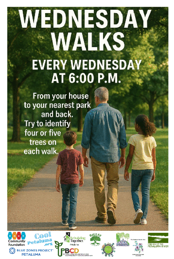 John: We’ve got maybe 10 or 20 participating organizations — churches, schools, Healthy Petaluma, our healthcare district, Blue Zones, Cool Petaluma. A lot of people realize it’s a great idea and want to get on board. Through churches, through schools, through every avenue, we’ve got quite a huge inroad of email addresses. We’ve also done it the old-fashioned way — going around putting signs up on telephone poles, so people walking past can say, “Oh, this is a good idea. Well, if I’m gonna go for a walk, I might as well go for a walk at 6:00 PM.”