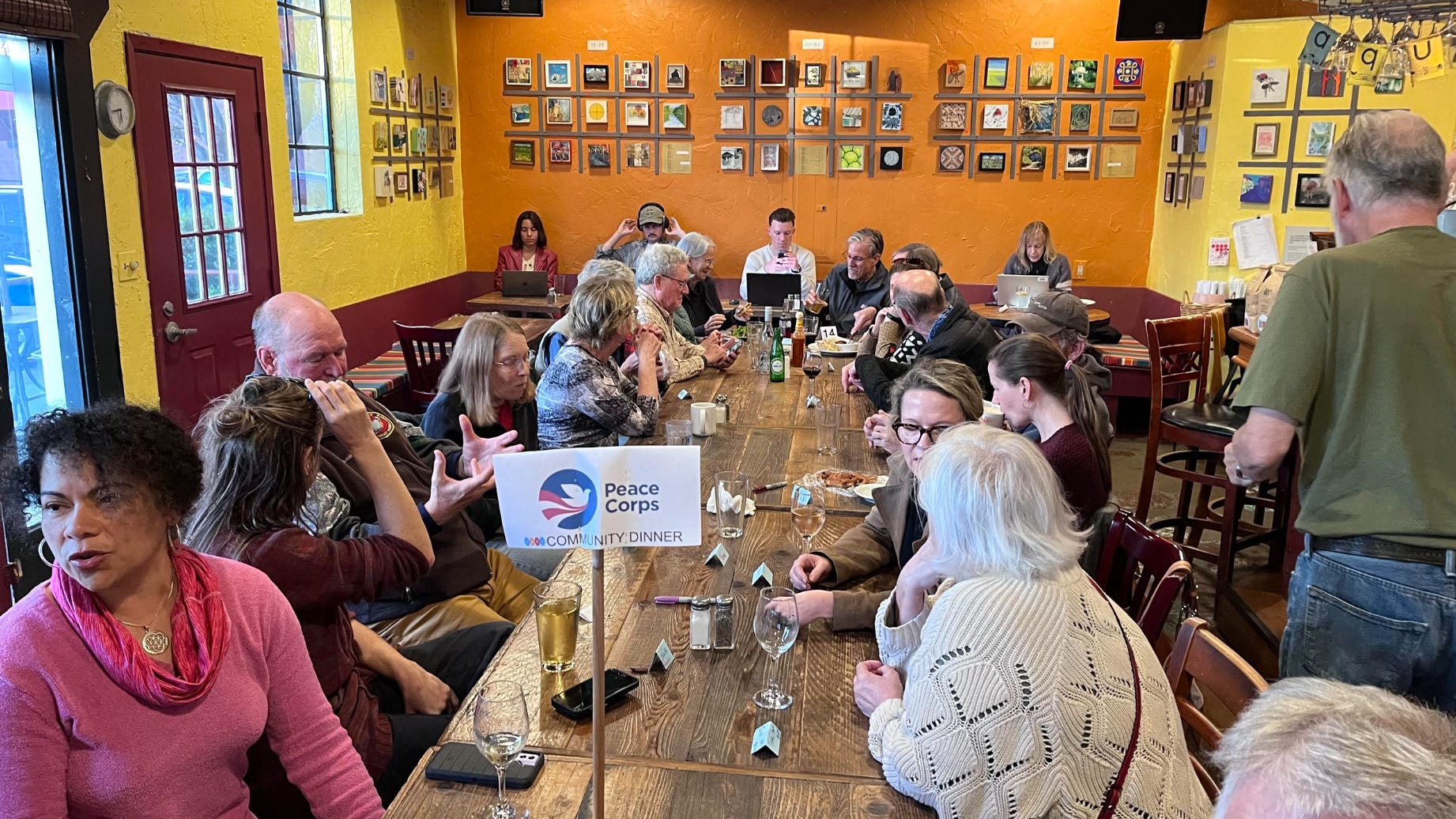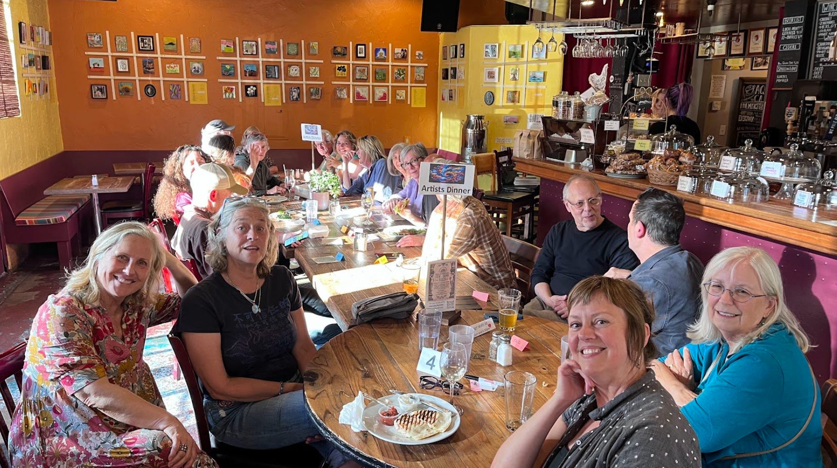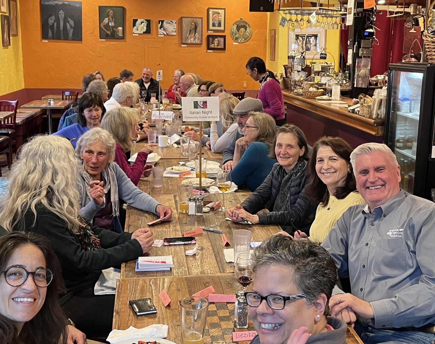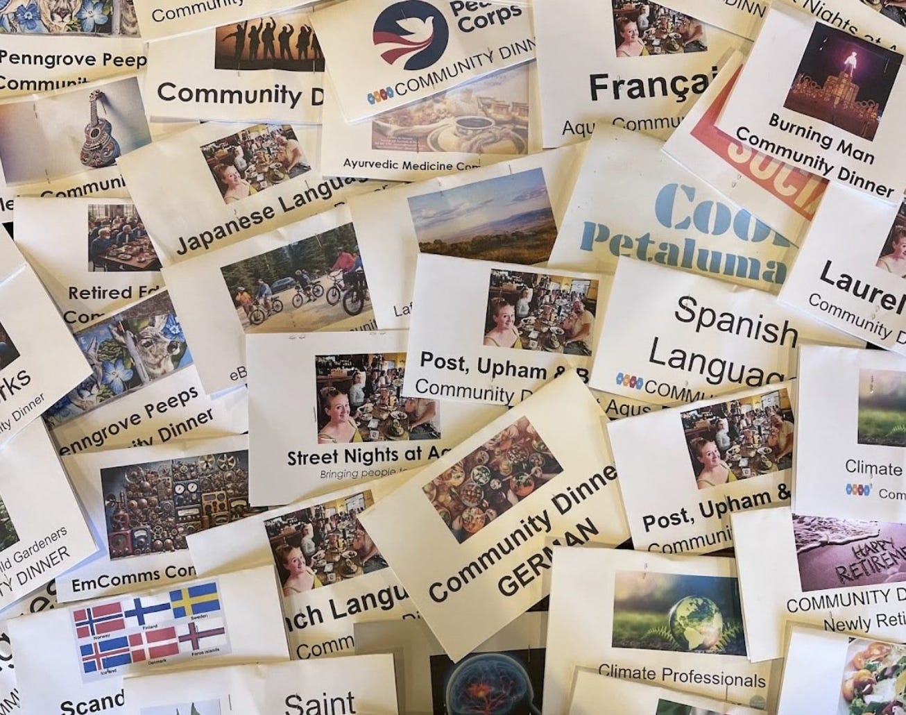 We move all the tables into one big long table in the café depending on how many people have RSVPed. And we invite everybody who… fill in the blank: Speaks Italian. Works as a nurse. Last week we had blacksmiths and metalworkers. A couple weeks ago, Camino walkers. So we have these community dinners designed to help people create relationships. You come in, you sit at the big long table, you get a name tag, and you sit beside somebody you’ve never met before — but you will have something in common with them. There is some common element there, be it blacksmiths or Italian or whatever it is.